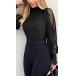 Combines of sassy and flirty vibes,this wonderful top can easily arouse your attention. Comes with a flattering black tone,finished with mock neck and sheer lace details,this piece not only can keep the comfy,but also can offer you different fashion styles by teaming with different style bottoms.