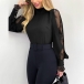 Sexy Sheer Lace Spliced Long Sleeve Mock Neck Solid Color Top