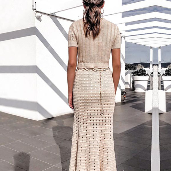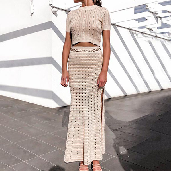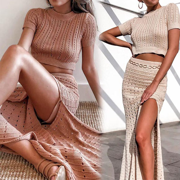 Your style and charm can have an instant boost when you dress yourself up with this two-piece set. Solid color style,including a short sleeve round neck crop top and a high waist slit hem fishtail skirt,this two-piece set can exude your sexy and feminine side. Definitely,you can gain more eyes when you wear this two-piece set.