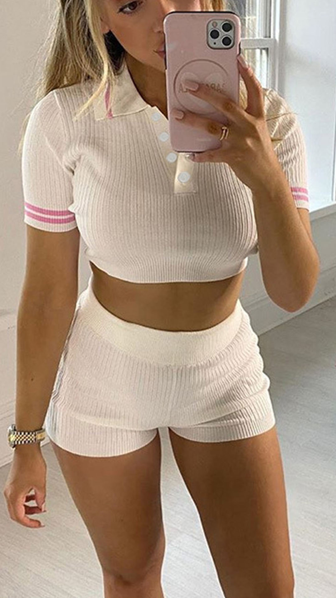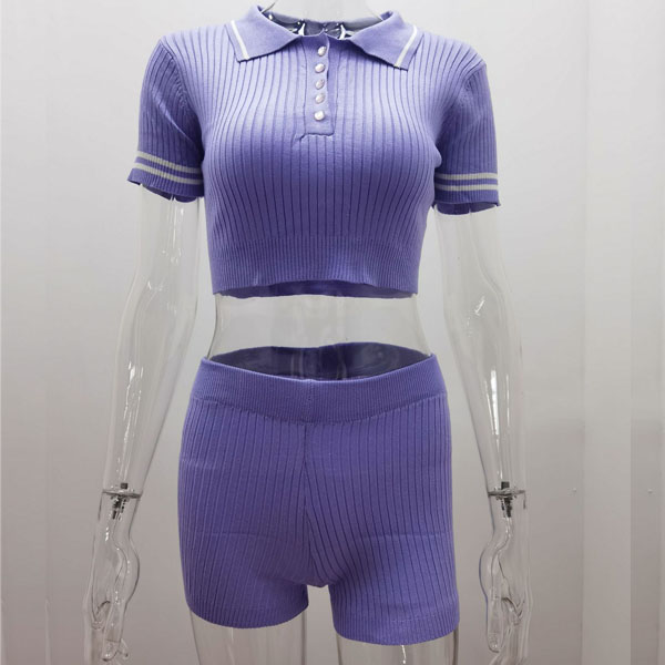 You can easily garb more eyes when you dress yourself up with this two-piece set. It consists of a short sleeve POLO collar crop top and a high waist shorts,this two-piece set is a good weapon to flaunt off your slender waist and perfect curve. For these hot summer days,this two-piece set can be your wise choice to express your beauty and charm.