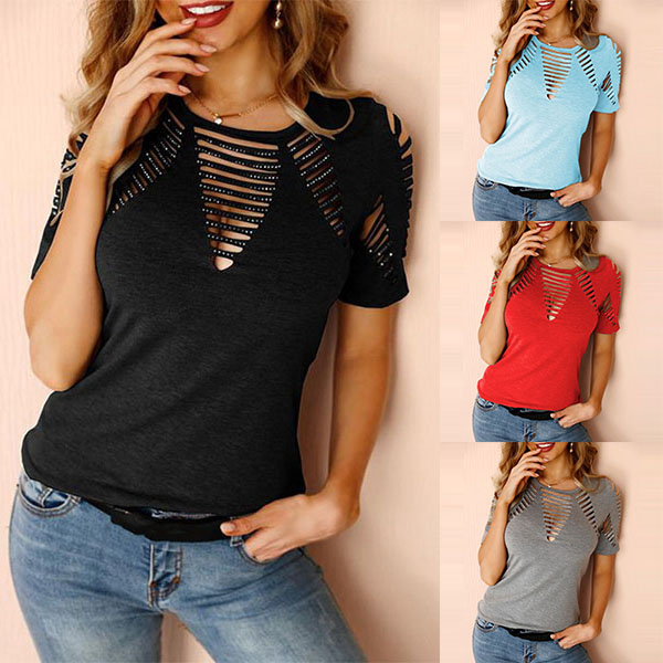 Compared with your other t-shirts,this piece can help you gain more eyes. Solid color style,the hollow out details make this piece look so distinctive and sexy,while its soft and breathable fabric can ensure you a comfortable day. Like it? Then add it to your wardrobe ensemble!