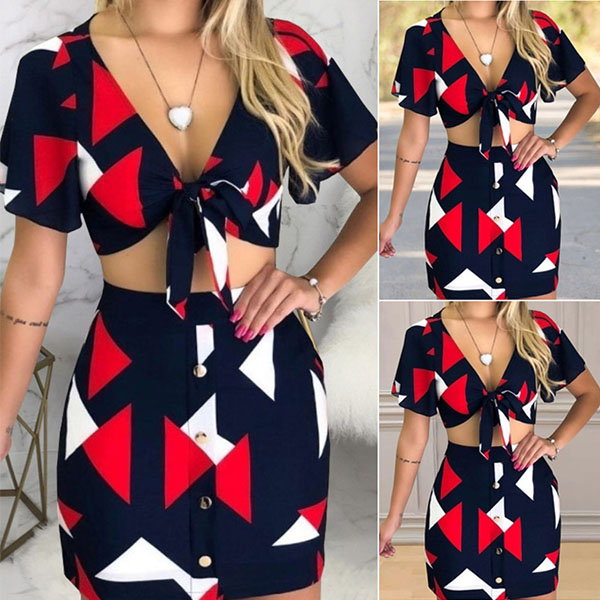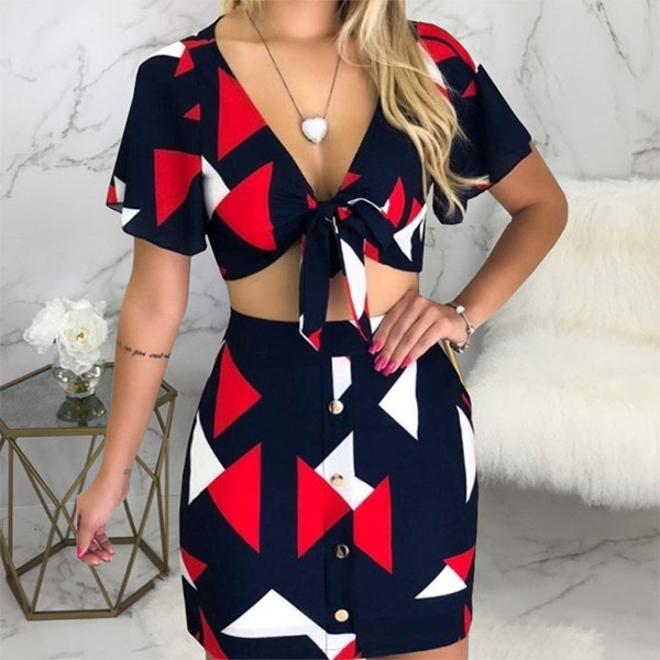 Sexy Short Sleeve V-neck Printed Crop Top + Skirt Two-piece Set