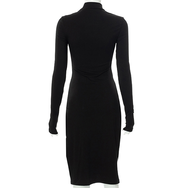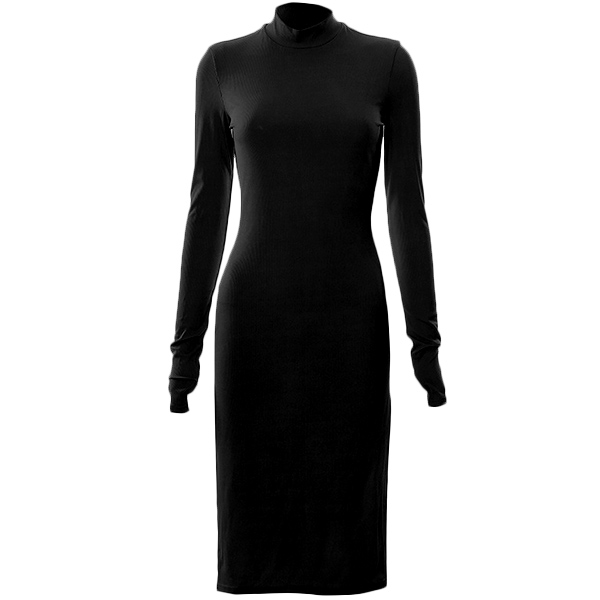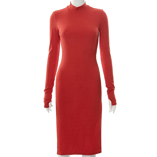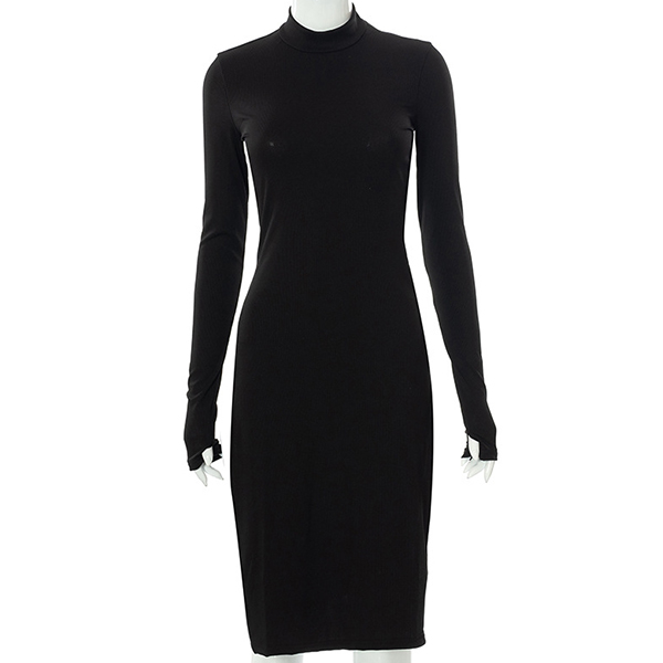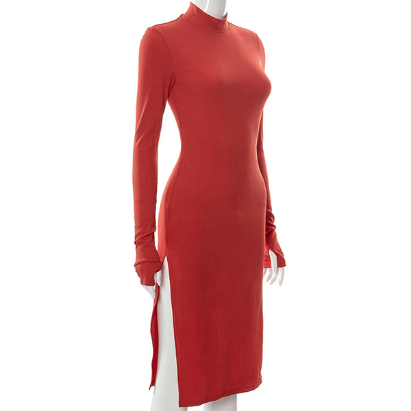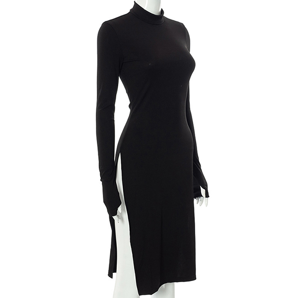 Sexy Side Slit-hem Long Sleeve Mock Neck Solid Color Slim Fit Dress