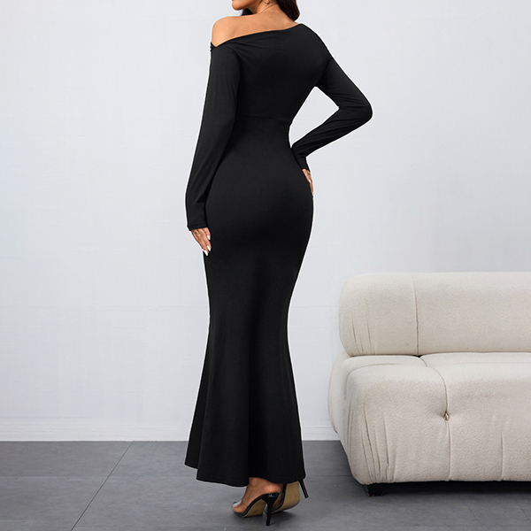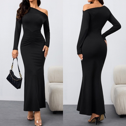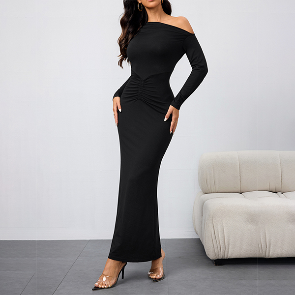 Sexy Slant Shoulder Long Sleeve Ruched Bodycon Maxi Dress