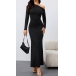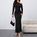 This black dress features a slant shoulder design that adds a modern and edgy touch to the look, while the ruched detailing creates a flattering and figure-enhancing silhouette. Perfect for party wear~