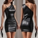 Sexy Slant Shoulder Sleeveless Artificial Leather PU Bodycon Dress