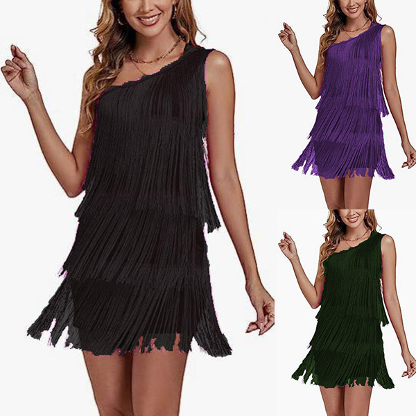 This dress features tassel details that add movement and playfulness. The slant shoulder design creates a unique and alluring look. Whether you're attending a cocktail party, a night out with friends, or a special event, this dress is sure to turn heads.