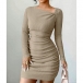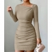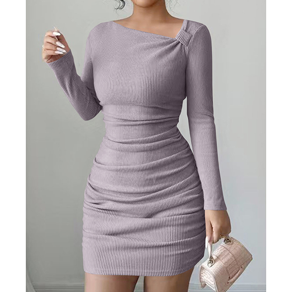 Sexy Slanted Neckline Long Sleeve Ruched Bodycon Dress