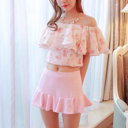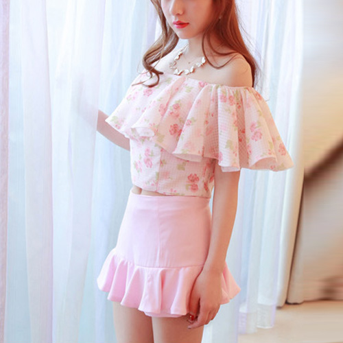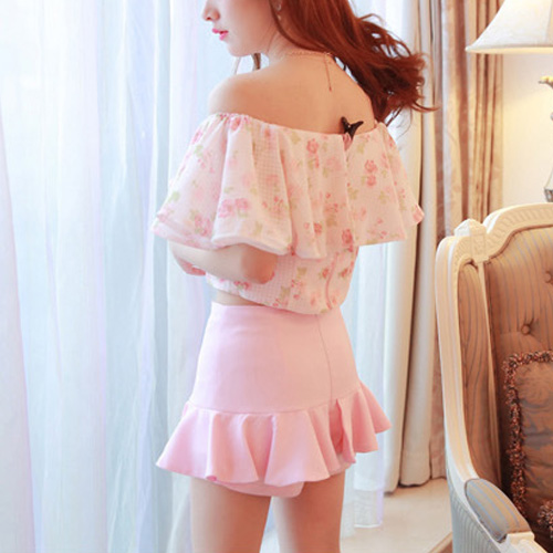 You look so feminine in this two-piece set. Tops with sexy flouncing slash neck style,