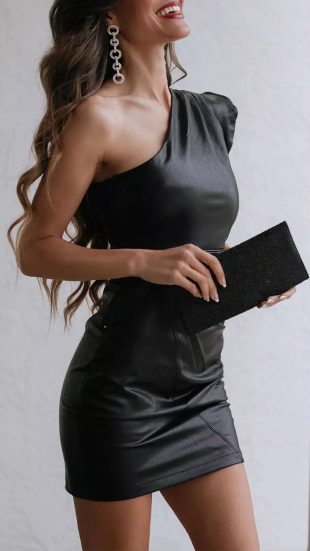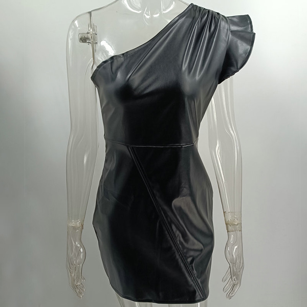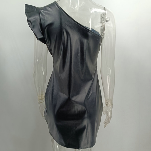 Mini bodycon dress in soft artificial leather. One-shoulder design with ruffle details which make it full of feminine. Team with your heels for a fashion and sexy party look.