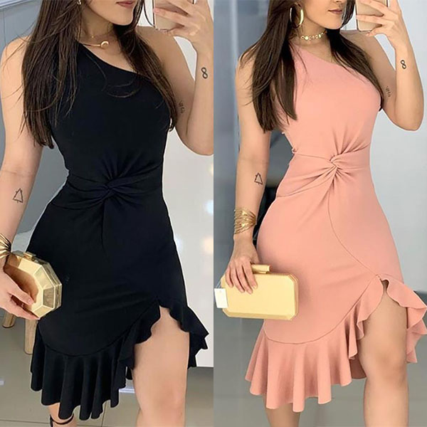 Exhibit your incredible style sense with this beautiful dress. Solid color tone design makes it look elegant and generous,while the irregular ruffle hem and twisted design will further enhance its charm. Pairing with your sexy heels and elegant clutch for the parties and gatherings,you can easily win more eyes.