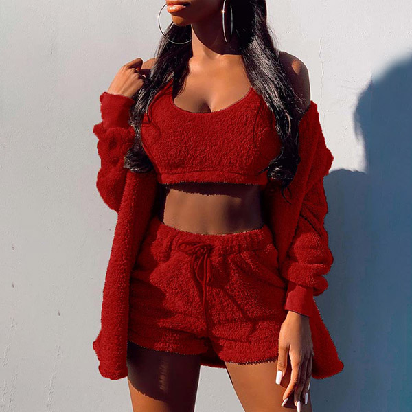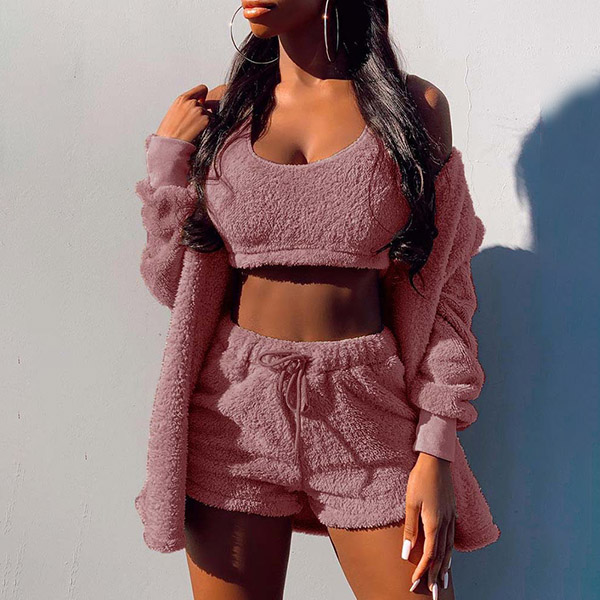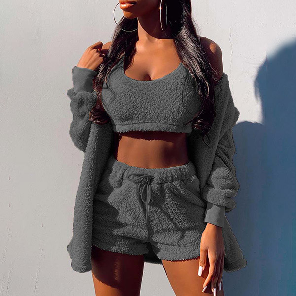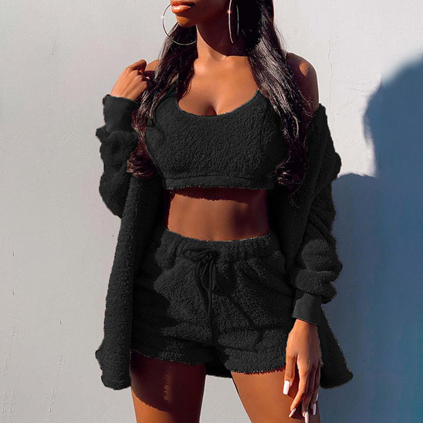 Sexy Sleeveless Round Neck Plush Crop Top + Shorts + Long Sleeve Cardigan Three-piece Set