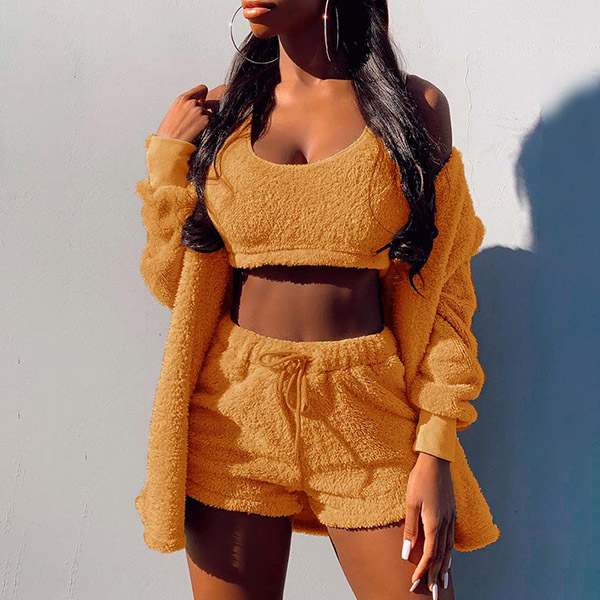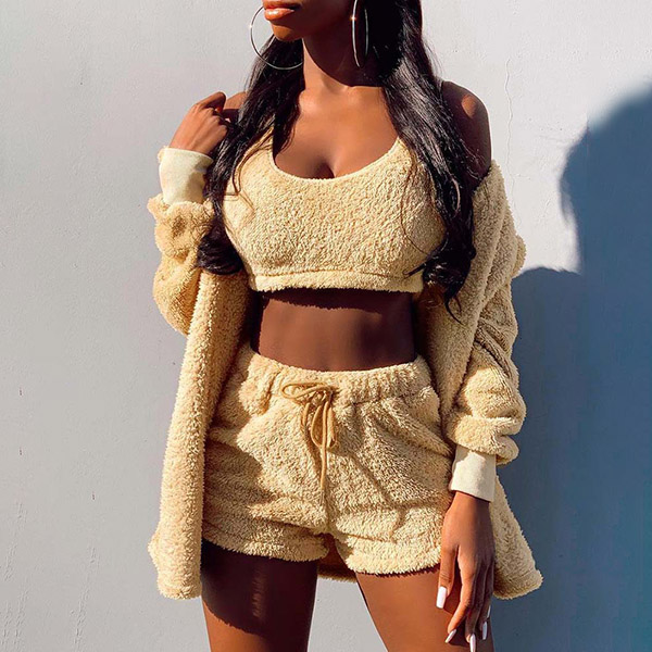 Wanna try a different style outfit? Then you can make your eyes focused on this three-piece set. Solid color style,including a sleeveless round neck crop top,a shorts and a long sleeve cardigan,this three-piece can showcase your seductive curve,while its soft and breathable plush fabric can ensure you a comfortable day.