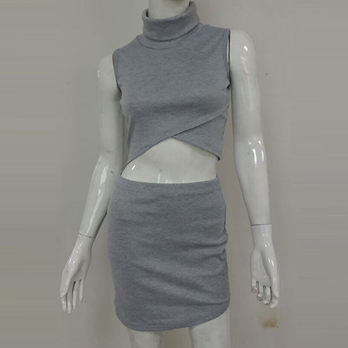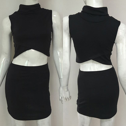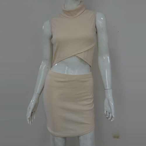 Solid color style,including a sleeveless turtleneck crop tops and a high waist bust skirt,this two-piece set is