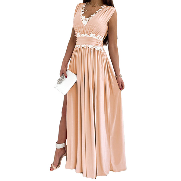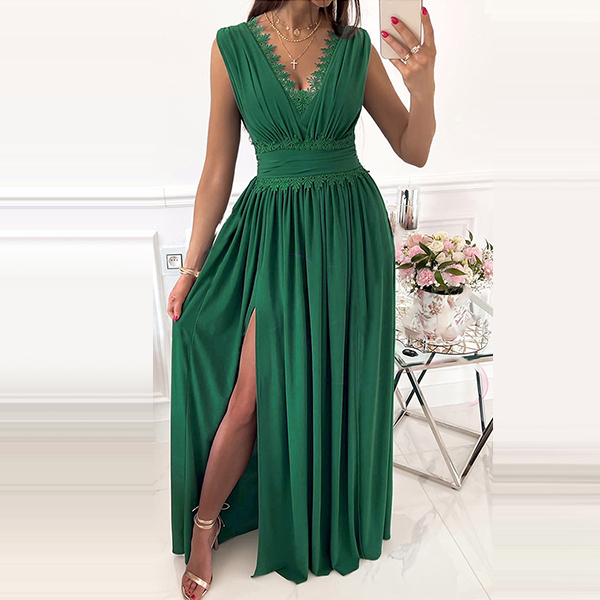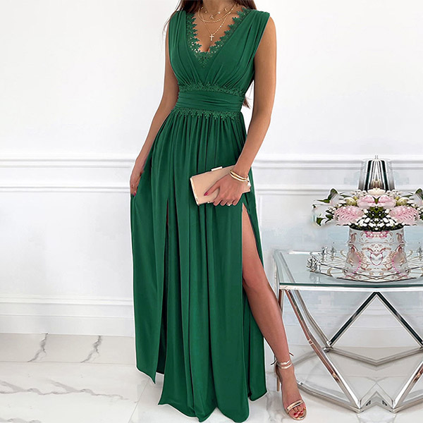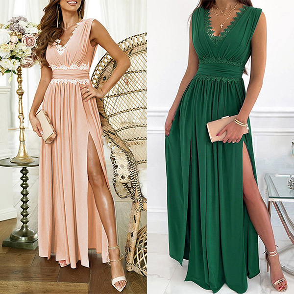 Don't know what to wear for the coming parties and gatherings? Then you can make your eyes focused on this piece. The v-neck,slit hem and lace spliced details make this piece look so sexy,flirty and alluring,while the high waist design can showcase your slender figure. Dress it up with your sexy heels,you can look beautiful enough!