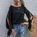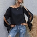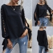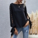 Sexy Slit Beaded Long Sleeve Round Neck Solid Color Top