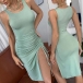 Sexy Slit Hem Sleeveless Round Neck Solid Color Slim Fit Dress