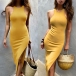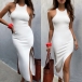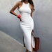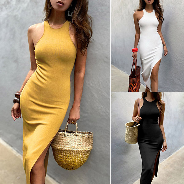 When the summer season hits,this dress can be your wise choice. Solid color style,finished with sleeveless,round neck and a tight silhouette,this dress is a good chance to flaunt off your slender figure. And the slit hem design will lend you some extra charm. For these summer days,this dress can easily strike your mind.