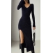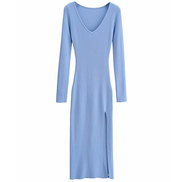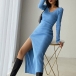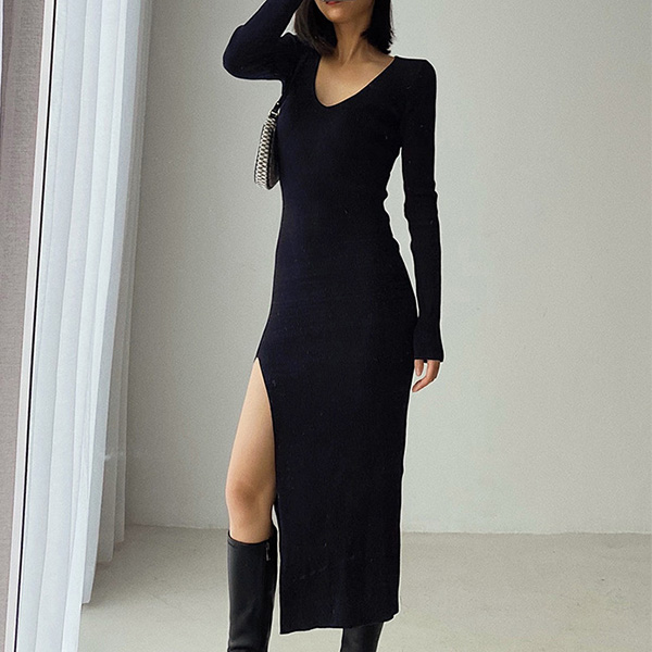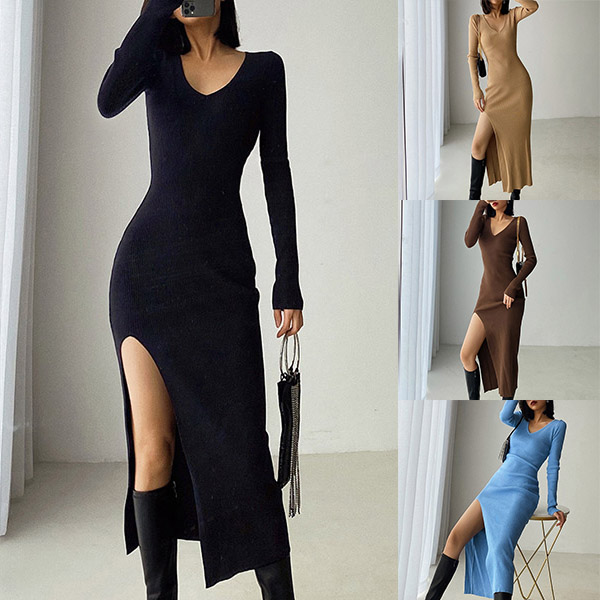 Sexy Slit Hem V-neck Long Sleeve High Waist Slim Fit Knit Dress