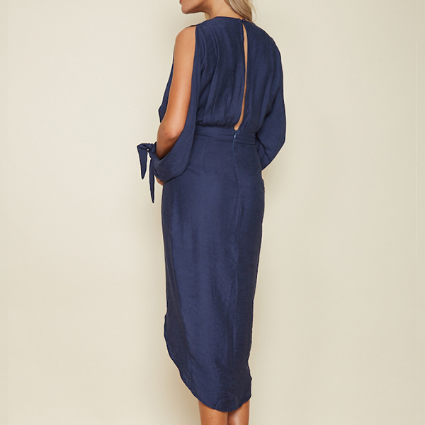Solid color style,accompanied with slit long sleeve,v-neck,high waist and an irregular hem,this dress knows how to