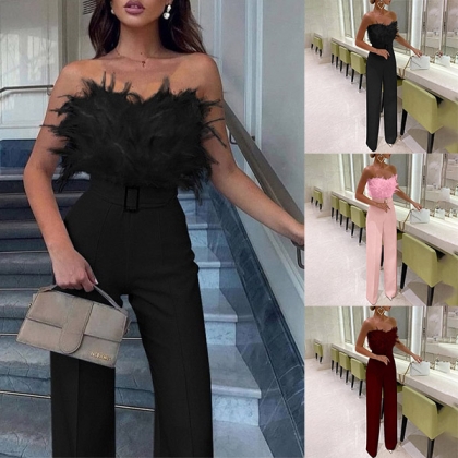 For a sexy and stylish party look, maybe you could try this jumpsuit. Is comes with artificial feather spliced at top and flared leg, full showcase your perfect curve and femininity.