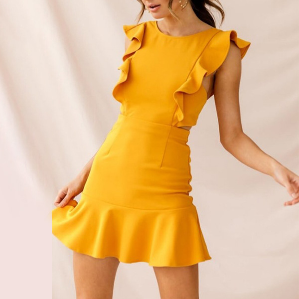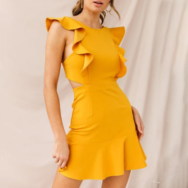 How about this dress? It features a solid color, backless design, side cutout details, and a ruffled hemline. The bodycon fit is perfect for showing off your curves.