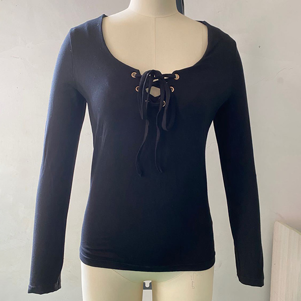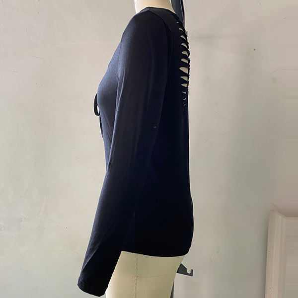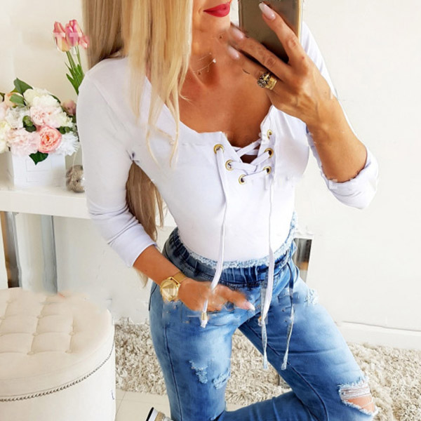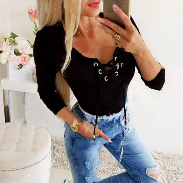Sexy Solid Color Backless Lace-up V-neck Long Sleeve Slim Fit Top