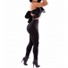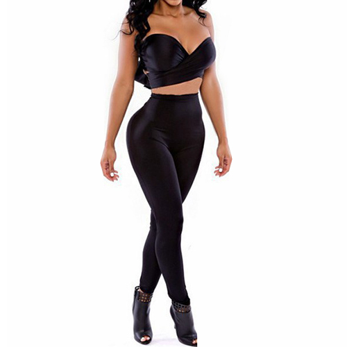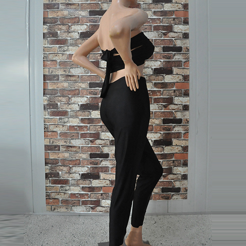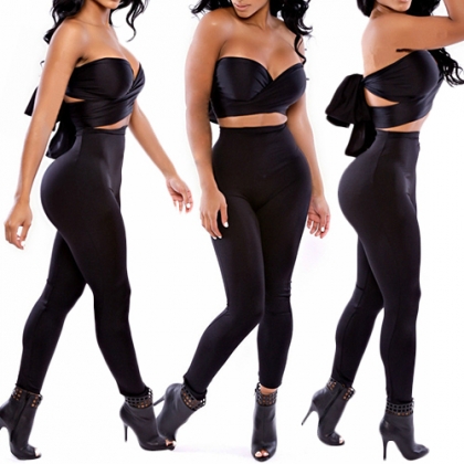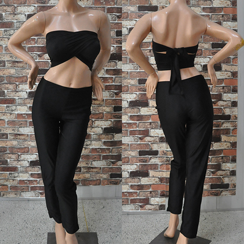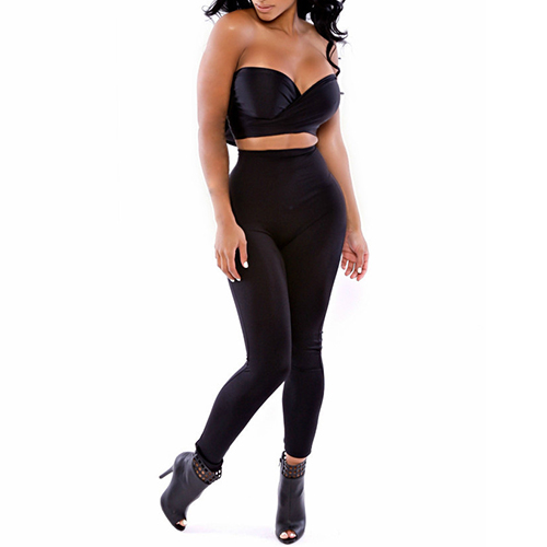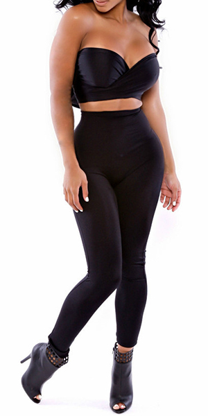 Boasting a mysterious and sexy black color, this set includes a bandeau and a high-waisted trouser.