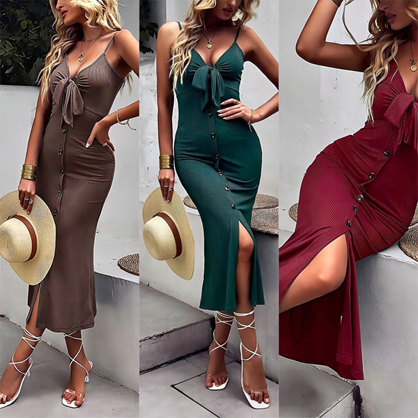 How about this dress? The ribbed texture of the fabric adds depth and texture to the dress, while the self-tie V-neckline and slit detailing create a flirty and alluring vibe. The dress is typically form-fitting, hugging every curve and accentuating feminine features. Wanna have a try?