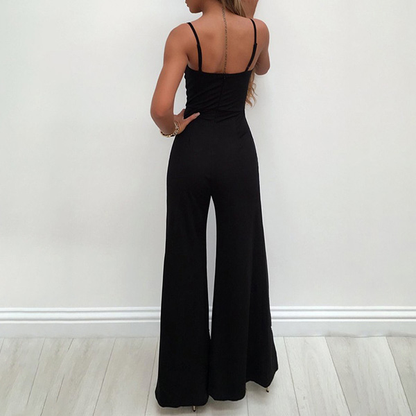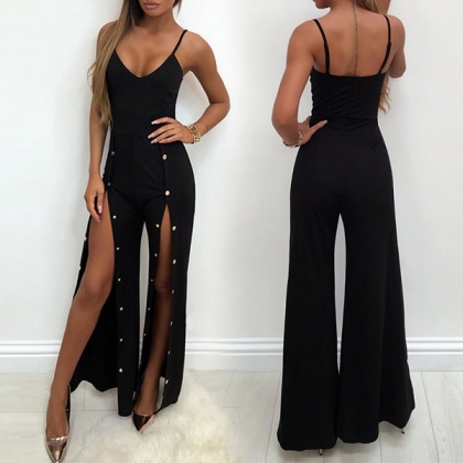 Sexy Solid Color Buttoned Slit Wide-leg Cami Jumpsuit
