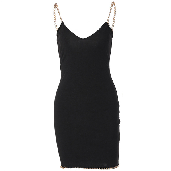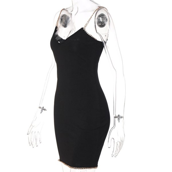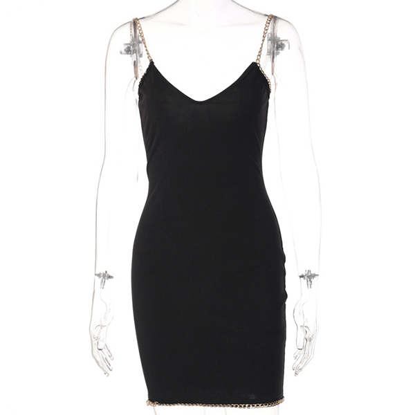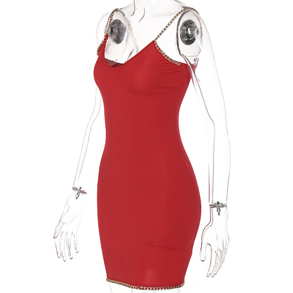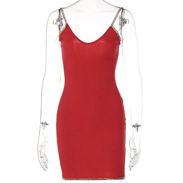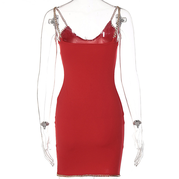 Look at this bodycon dress! Solid color, mini length. And the best part? The chain detail adds a touch of edge and attitude. Whether you're headed to a party or a night out on the town, this dress is sure to get you noticed.