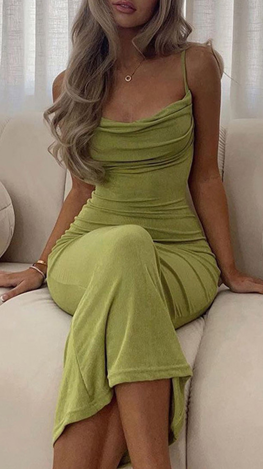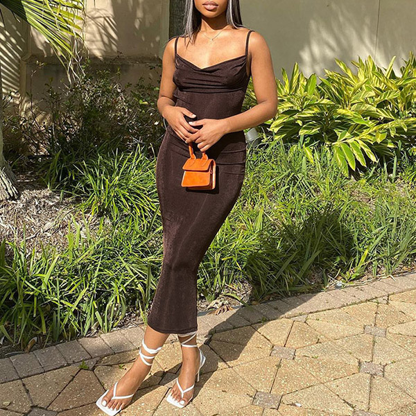 This is a sexy maxi dress that is sure to turn heads. The dress is made from a stretchy material that will hug your curves in all the right places. The cowl neckline is both sexy and elegant, and the maxi length of the dress makes it perfect for a night out on the town.