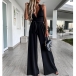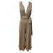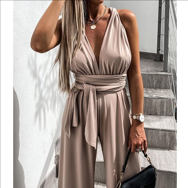 This jumpsuit features a cross-criss design, it could be a V-neckline jumpsuit, also could be a one-shoulder jumpsuit. Wide-leg silhouette, backless with criss-cross details. Pair it with your favorite heels and clutch for a complete look.