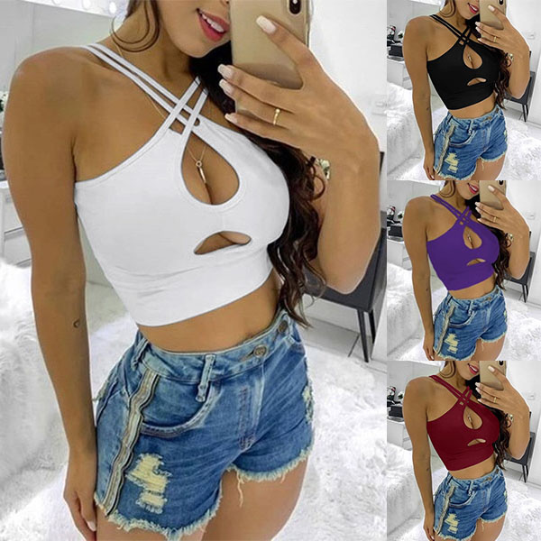 When you wanna flaunt off your charming skin and slender waist,you can just slip into this crop top. Boasts a solid color,the crossover and hollow out design make this piece look so alluring. Matching with your high waist shorts would be a good idea.