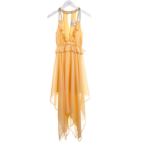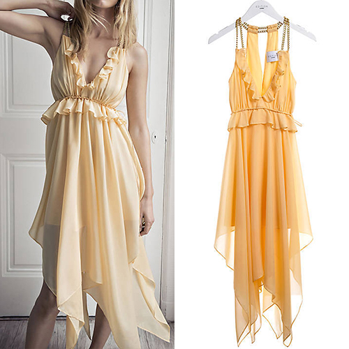 And irregular hem and gathered waist design make it more attractive. Moreover, the gold sling adds your distinctive flavor. Such a wonderful dress! What a pity to miss it!
