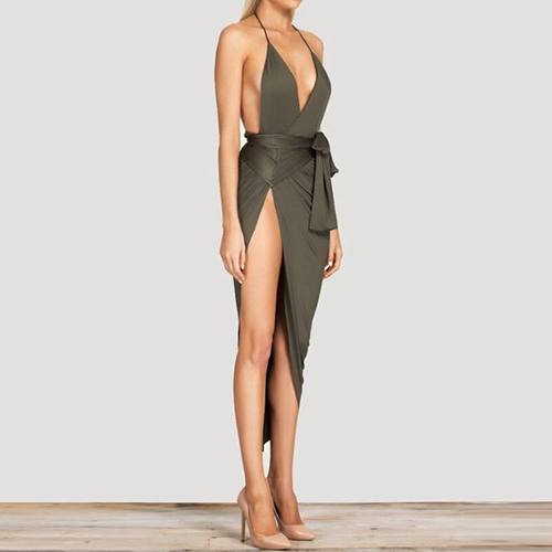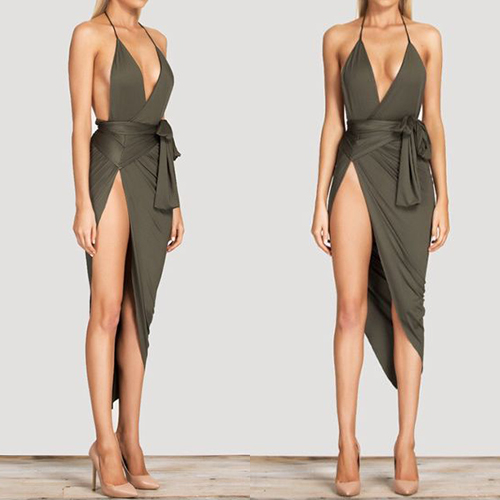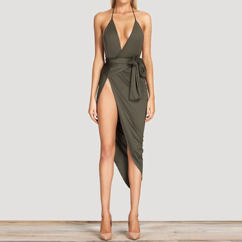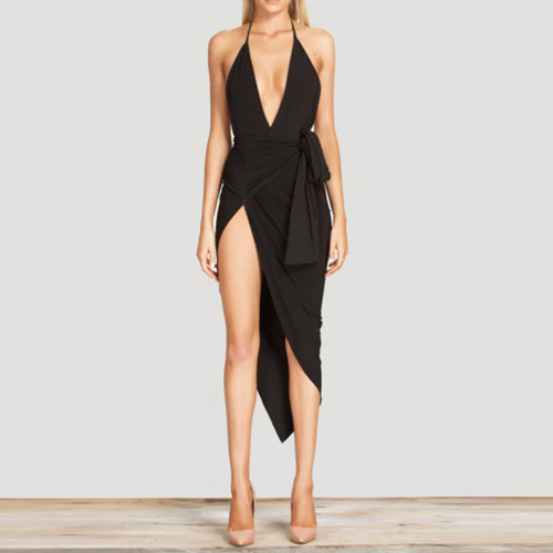 This dress features deep v-neck, sleeveless, backless and irregular hem design, sexy and