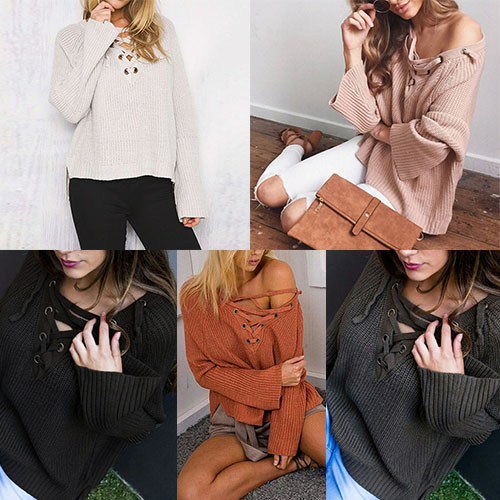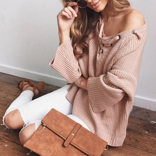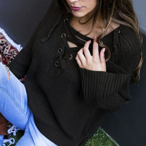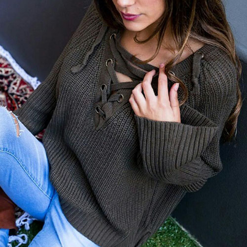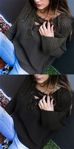 Sexy Solid Color Front Criss Cross V-neck Long Sleeve Sweater