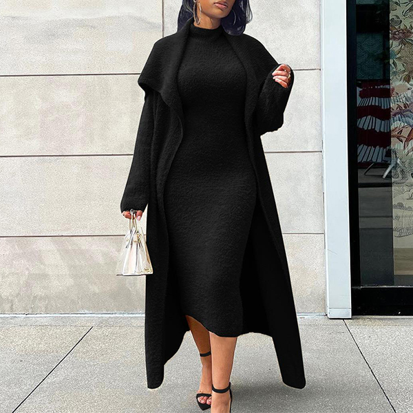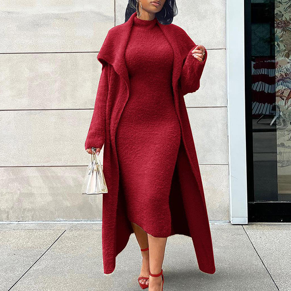 This set is the epitome of chic and sophistication, perfect for making a statement at any event. The cardigan features a solid color design, adding a touch of elegance and versatility to your outfit. The mock neck sleeve bodycon dress is designed to hug your curves and accentuate your figure. Embrace your inner fashionista with this captivating and fashionable set.