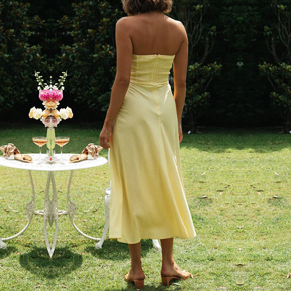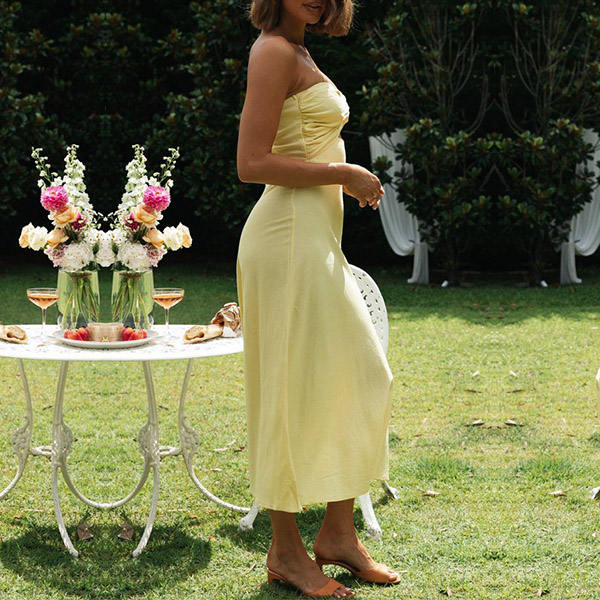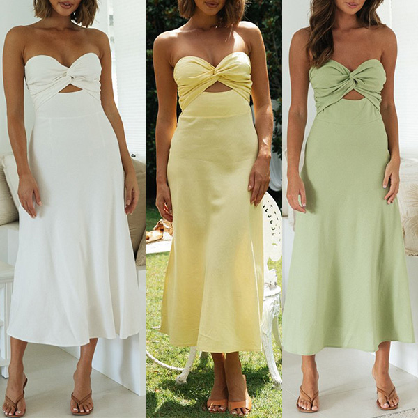 How about this summer dress? The strapless design with knot-knit bodice is chic and stylish, while the solid color gives it a classic look. The midi-length is perfect for any occasion, from a night out to a formal event.