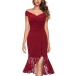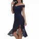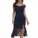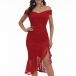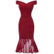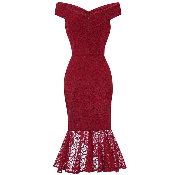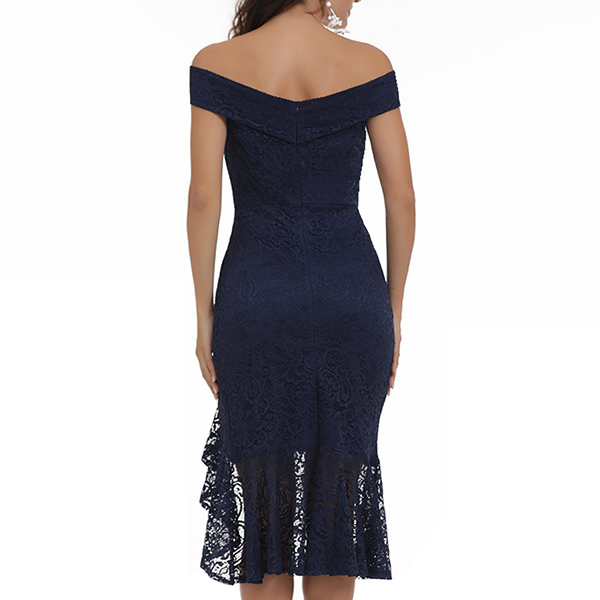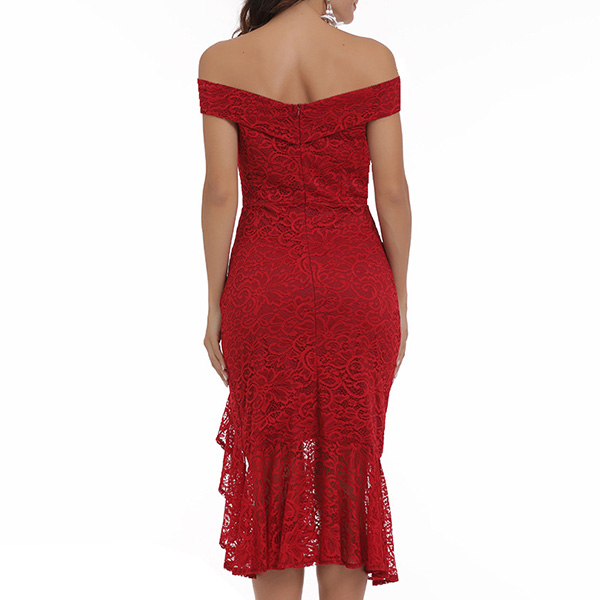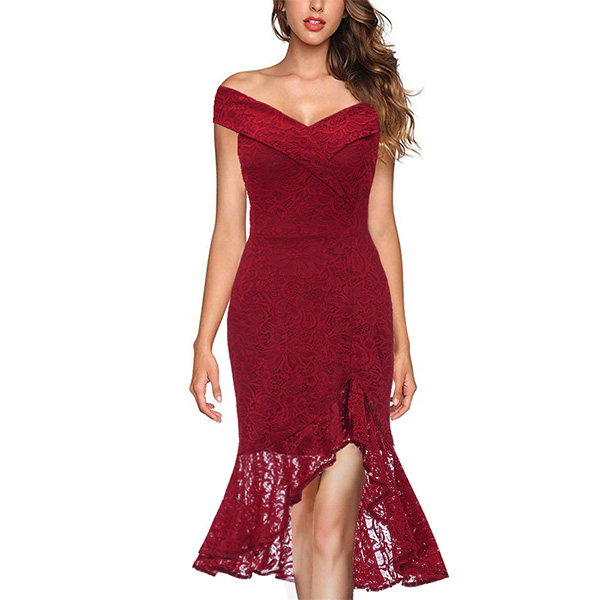 This alluring dress is perfect for those who love to make a bold fashion statement. The solid color design keeps the focus on the stunning off-the-shoulder neckline, which is adorned with delicate lace detailing. The slit lace design adds a touch of sexiness, making this dress the perfect choice for a night out on the town.