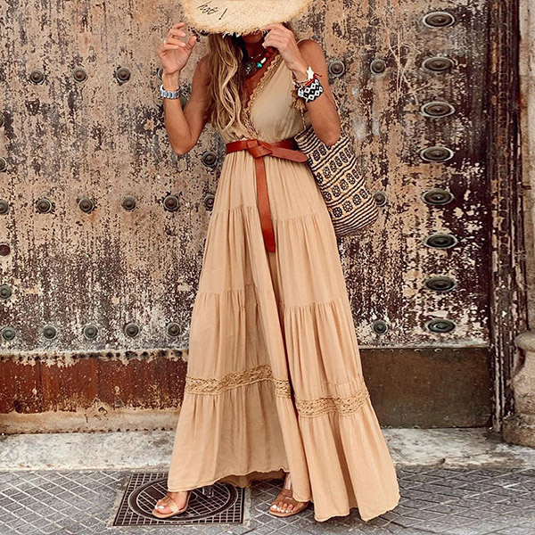 Sexy Solid Color Lace Spliced V-neck Sleeveless Tiered Maxi Dress