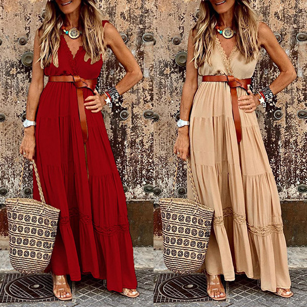 This is a beautiful and sexy maxi dress that is perfect for any formal or special occasion. It features a solid color with lace splicing along the V-neck, sleeveless design, and a tiered skirt. This dress is sure to turn heads and make you feel confident and gorgeous.