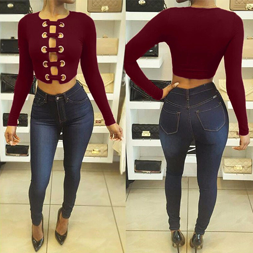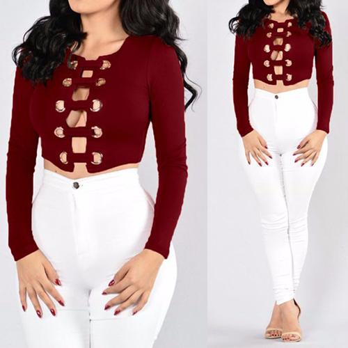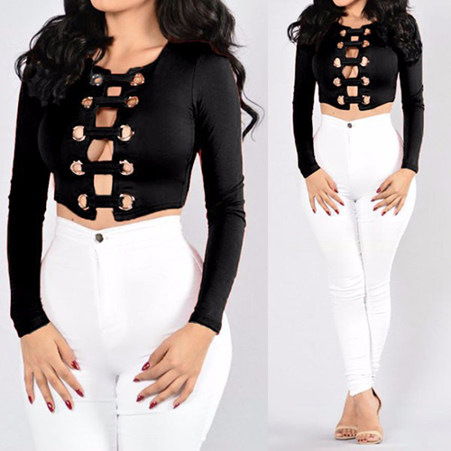 Featuring solid color, long sleeve and bold front hollow out design, this crop T-shirt can perfect