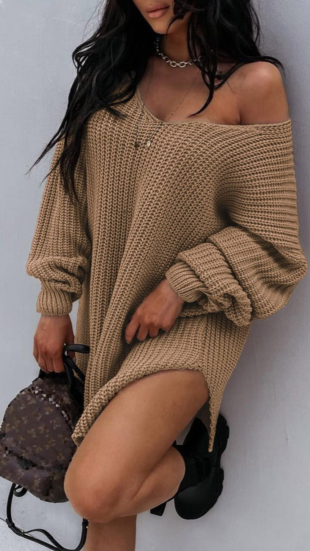 Sweater dress featuring knitted fabric, sexy V-neck, long sleeve and high-low hemline. Multi-colors available.