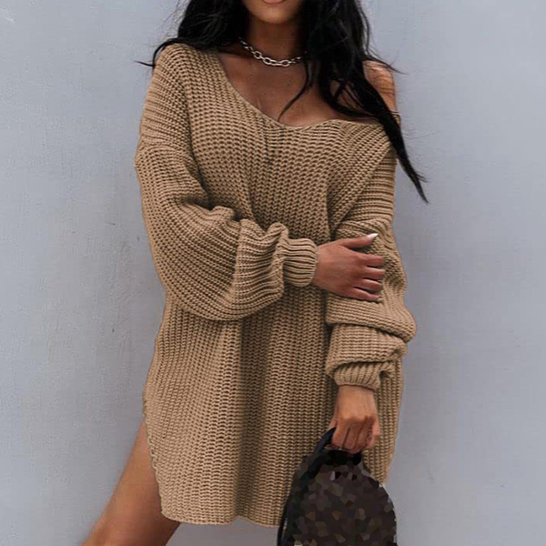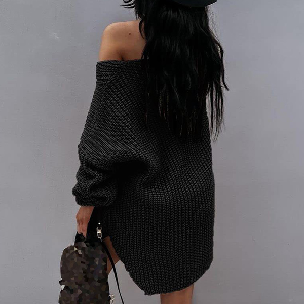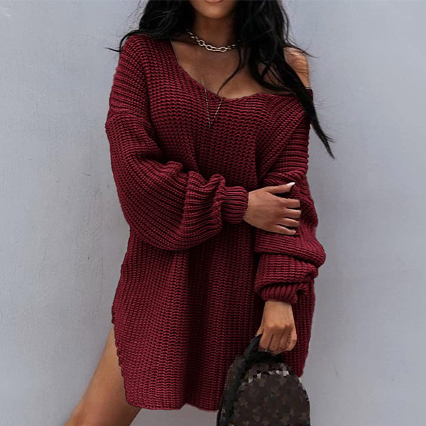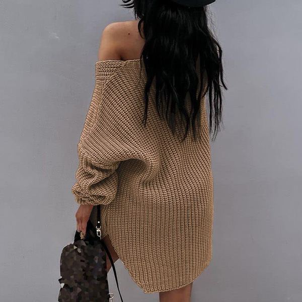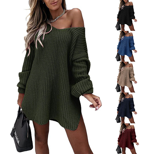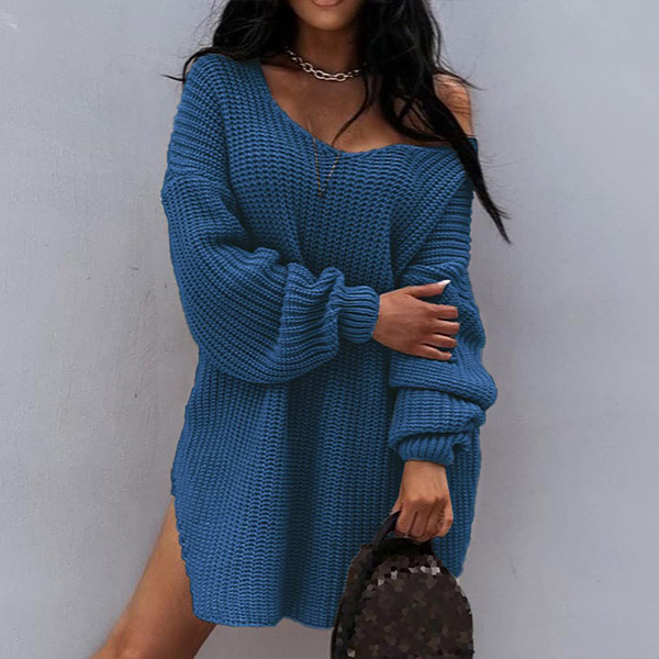 Sexy Solid Color Long Sleeve V-neck One-shoulder Knitted Sweater Dress