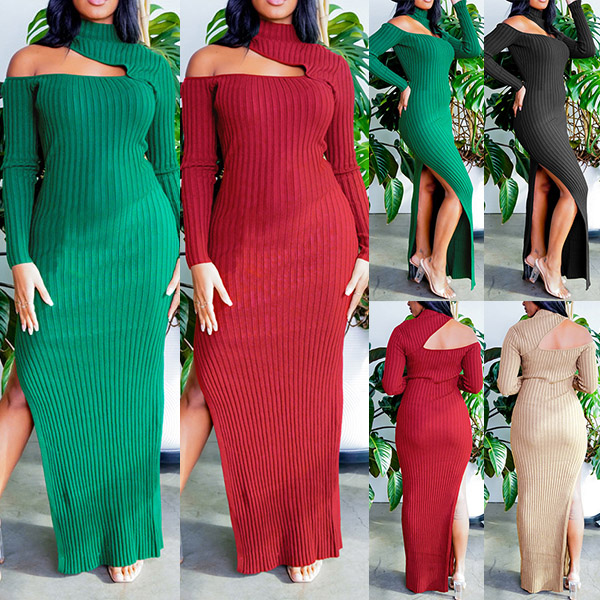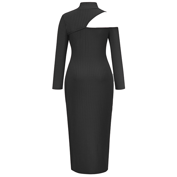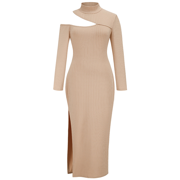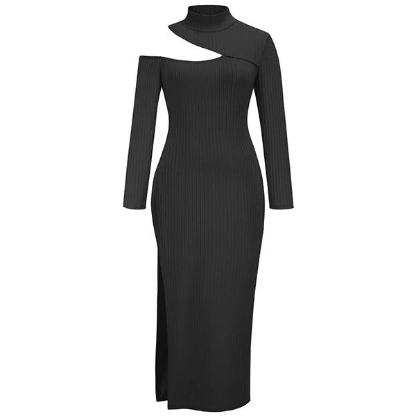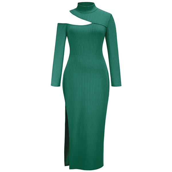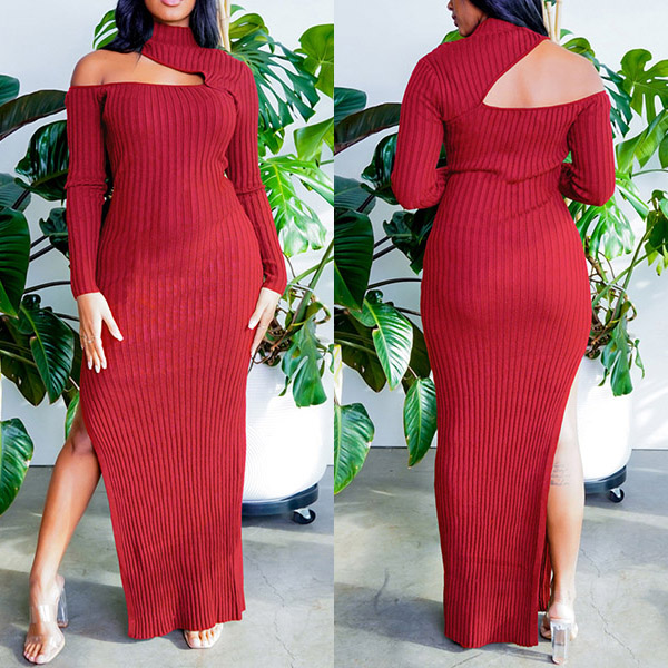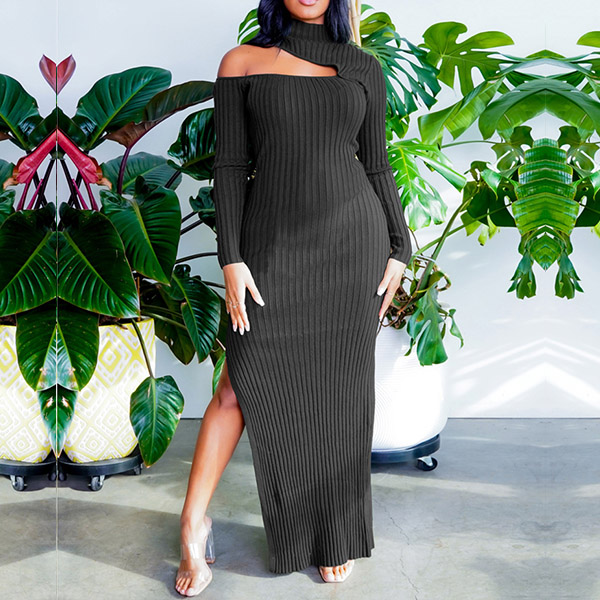 Sexy Solid Color Mock Neck Cutout Long Sleeve Slit Knitted Maxi Dress
