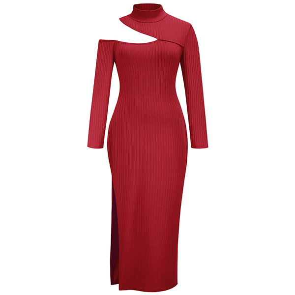 This is a stunningly sexy knitted maxi dress that is sure to get you noticed! It features a mock neck, long sleeves, a cutout detail on one shoulder and a slit up the side, and the knit fabric is both comfortable and figure-flattering. Dress it up with heels and jewelry for a night out, or keep it casual with flats and a denim jacket. However you style it, you're sure to look and feel your best in this gorgeous dress.