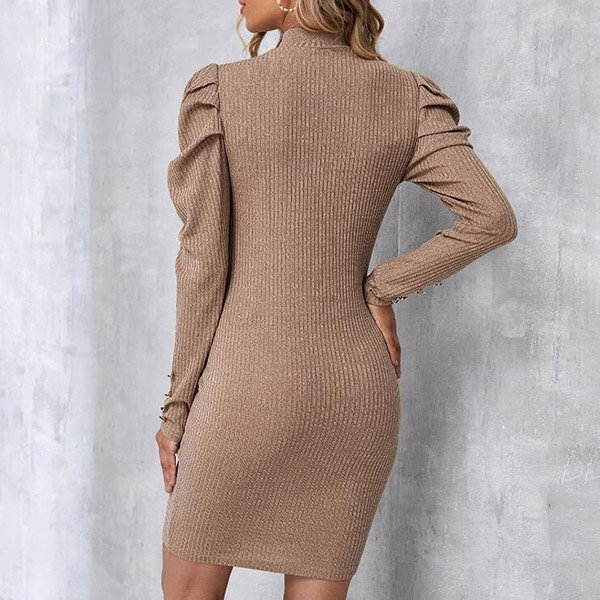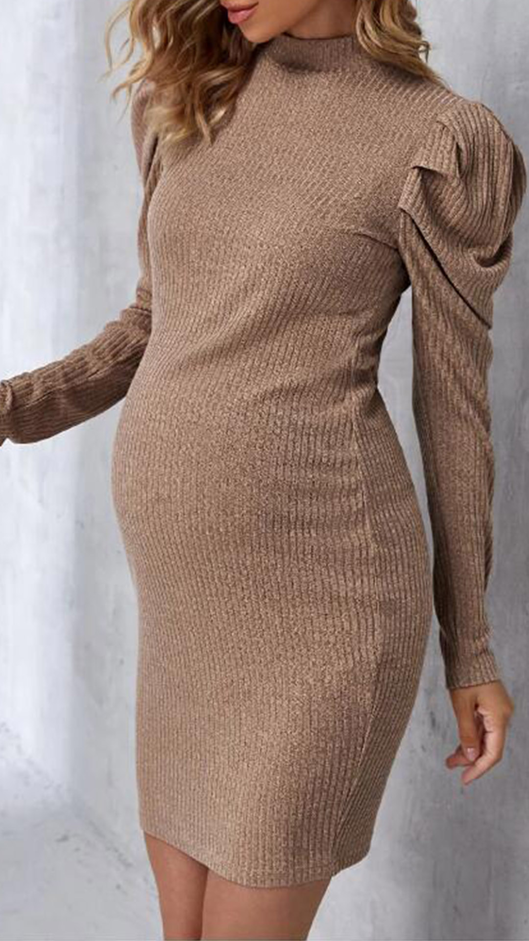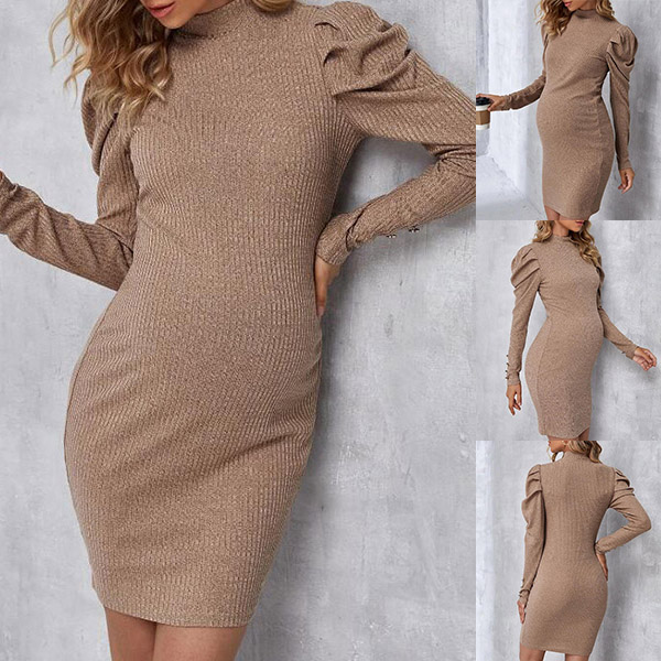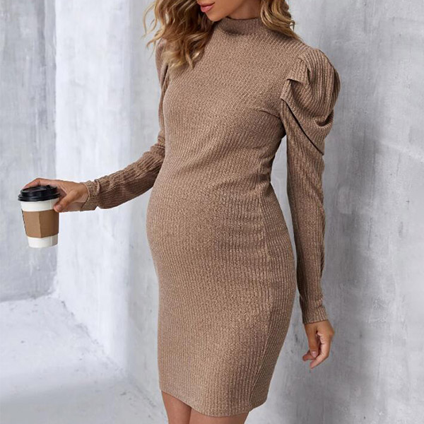 Sexy Solid Color Mock Neck Puff Long Sleeve Ribbed Bodycon Maternity Dress