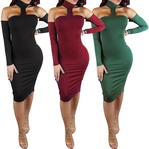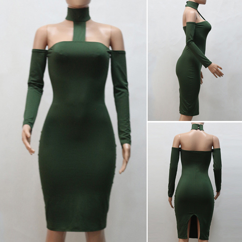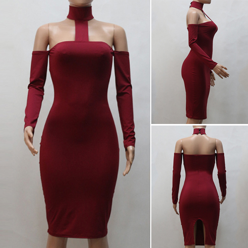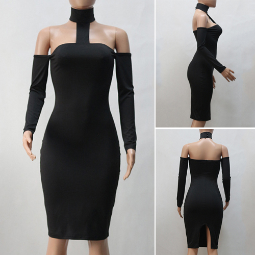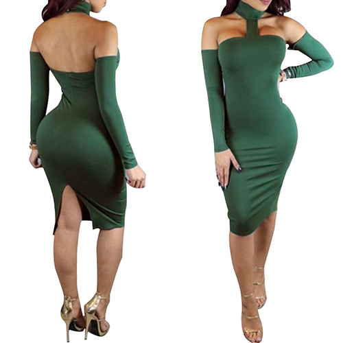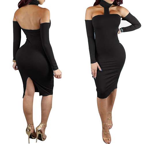 Backless construction, accompanied with off shoulder, back slit and long sleeve design, this dress