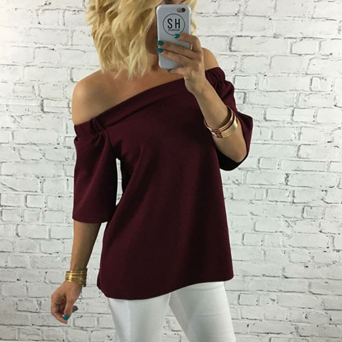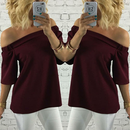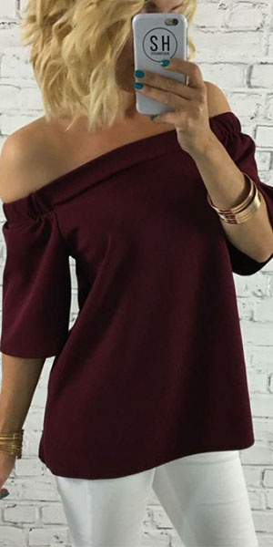 Trendy and noble wine red can highlight your fair skin. With off shoulder and half sleeve design,